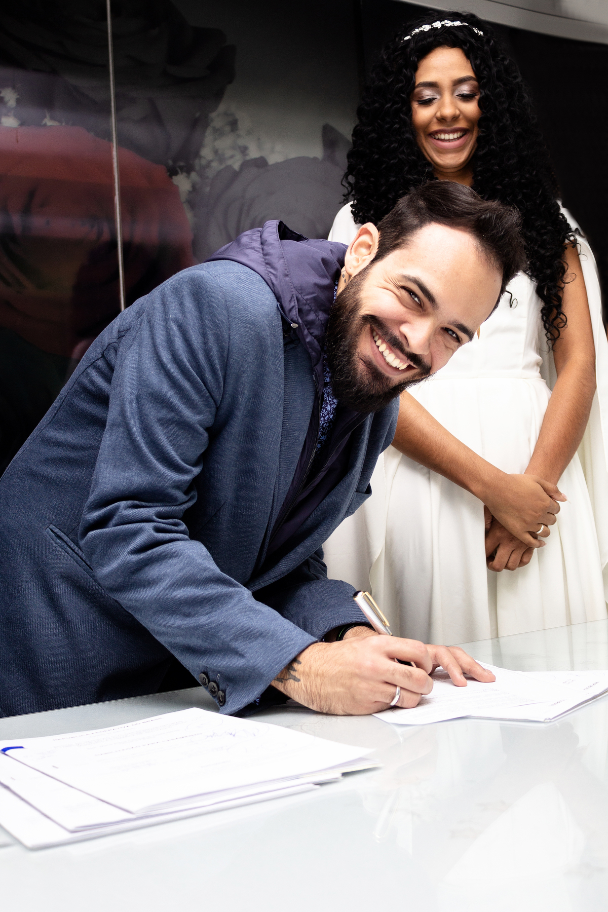 A foto que quero comentar é a do esperado momento de receber a certidão, sem combinar com os recém casados pedi para os dois lerem a certidão na hora que receberam os dois pegaram sem entender leram e riram, assim ficou cravado mais um momento em imagem. Agradeço ao casal a confiança dada em meu trabalho, espero atende-lo mais vezes.
